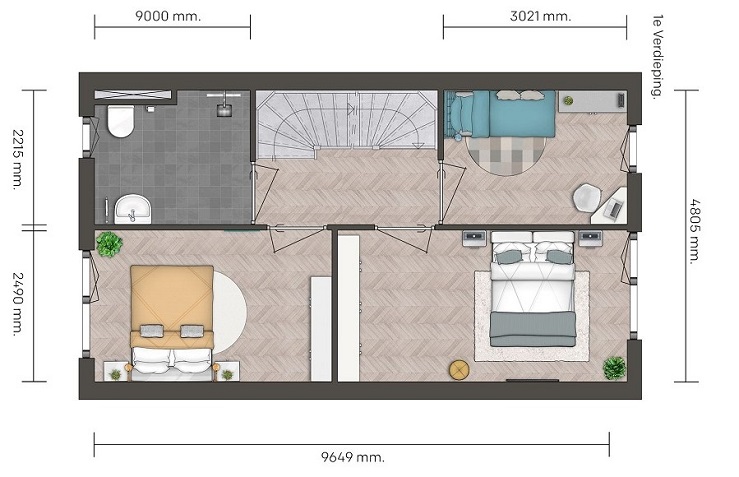 Indeling 1e verdieping : Via de trap komt u op de eerste verdieping met drie mooie slaapkamers en een badkamer. De badkamer is voorzien van douche, 2e toilet, designradiator en wastafel.
